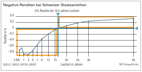Hans-Jörg Baumann von der Gesellschaft Swiss Capital Group wies in seinem Vortrag auf die schwierige Suche nach Ertragsquellen hin. So liegen die Renditen von Schweizer Staatsobligationen derzeit bis zu einer Laufzeit von 16,5 Jahren im negativen Bereich. Von weltweit ausstehenden Staats- und Unternehmensanleihen im Volumen von 89,5 Bio. $ rentiere derzeit ein Volumen von 15,4 Bio. $ im Minus. Japan macht dabei knapp die Hälfte dieses Volumens aus, Deutschland 11,2%, Frankreich 10,1%, die restlichen EU-Länder 22,5% und die Schweiz 1,3%.