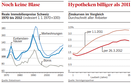 Es ist ein bekannter Fakt: Die Zinsen verharren im langfristigen Vergleich auf rekordtiefem Niveau. Verglichen mit vor 12 Monaten sind sie gar noch weiter gefallen. Eine zehnjährige Hypothek beispielsweise hat sich gegenüber dem Vorjahr von rund 3,25% auf 2,25% verbilligt. Kurzlaufende Hypotheken kosten weniger als 1% pro Jahr. Solch tiefe Zinsen machen den Kauf von Eigentum attraktiv. Mieter zahlen im Vergleich zu Eigentümern seit längerem zu viel für das Dach über dem Kopf. Zwar sind viele verunsichert wegen des Geschreis um eine Blase am Immobilienmarkt. Die reale Preisentwicklung zeigt aber, dass davon – im Durchschnitt – noch keine Rede sein kann (siehe Grafik).