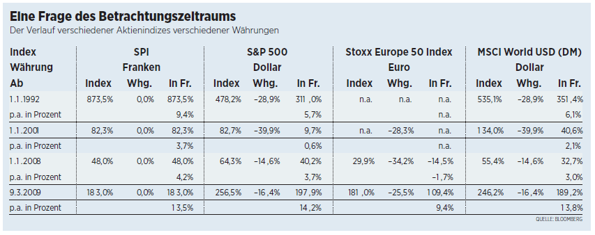Ein realistisches Bild, was Aktien langfristig abwerfen, liefert wohl weder der Start noch das Ende von Börsenkrisen. Betrachtet man sodann einen Horizont von 25 Jahren, so errechnen sich für die verschiedenen Indizes Renditen, die durchaus repräsentativen Charakter haben, weil sie sowohl Haussen wie Baissen über eine längere Zeit beinhalten. Während die wiederum in der Referenzwährung Franken gerechnete Durchschnittsrendite des Schweizer Aktienmarktes 9,4 Prozent beträgt, resultiert beim Weltmarkt eine von 6,1 Prozent und für den amerikanischen Markt eine von 5,7 Prozent.