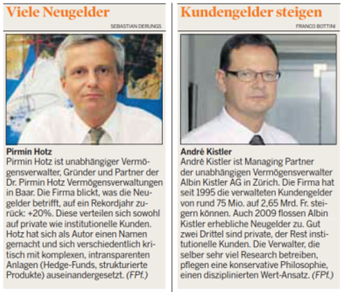 Kistler: Die Welt ist von anhaltenden und notwendigen Strukturanpassungen geprägt, es gibt kein besseres Regulativ als den Markt. 2010 wird ein Jahr der Bereinigungen. Also ein Jahr mit grossen Schwankungen, mit bunter Abfolge von positiven und negativen Überraschungen. Grosse Umkehrprozesse dauern immer länger, als uns lieb ist. 2010 wird keine neuen grossen Trends aufzeigen, aber es wird die Basis für neue Trends gelegt. Die neuen Antriebskräfte sind noch immer die alten, die Globalisierung wird über die nächsten Jahre enorme Kräfte frei-setzen. Das Internet und die Technologisierung ermöglichen rasche und kluge Anpassung von Strukturen und Prozessen.